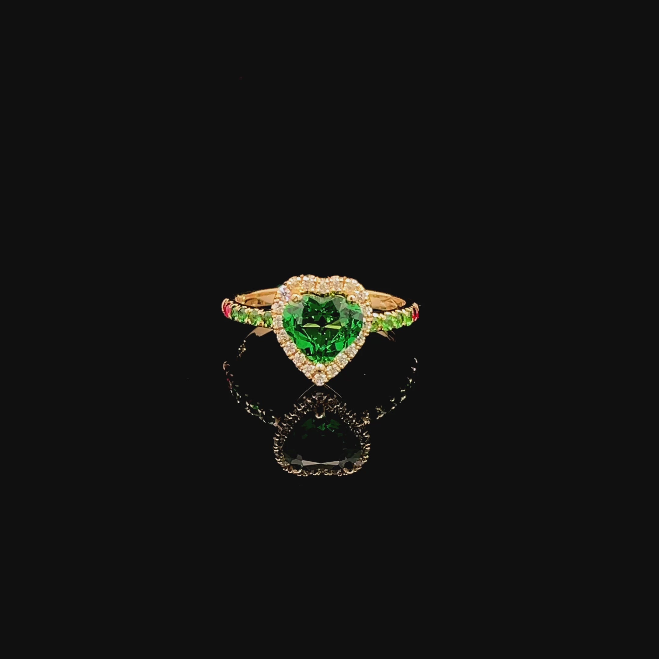 Triple 'A' Tsavorite garnet heart shape. Natural luxury diamond finish, G vs. Tsavorite round brilliants in shank with ruby signature. From our more accessible Millenials collection with an investment element. Yellow gold 18kt.