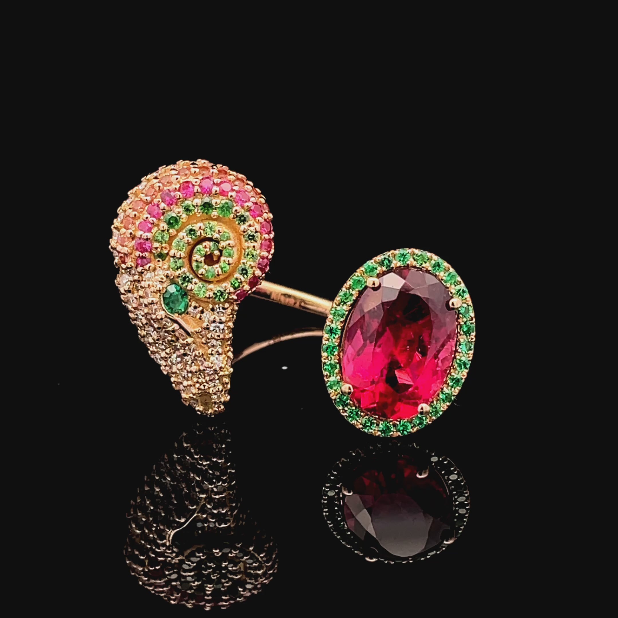 Duo ring containing our brand's cult symbol. Here with large Rubellite Tourmaline. Multi colour setting with natural emeralds, white diamonds, tsavorite and sapphires. A Kimball Jewelry statement, not to be ignored by the bravest of fashionistas. Pink gold 18 kt.