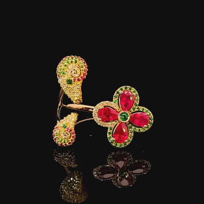 Original Fidelio triogy in Ever-Changing evolutions. Here with A grade natural ruby pear shapes, tsavroite and white diamond finish. A trend is set, no return. Pink gold 18 kt.