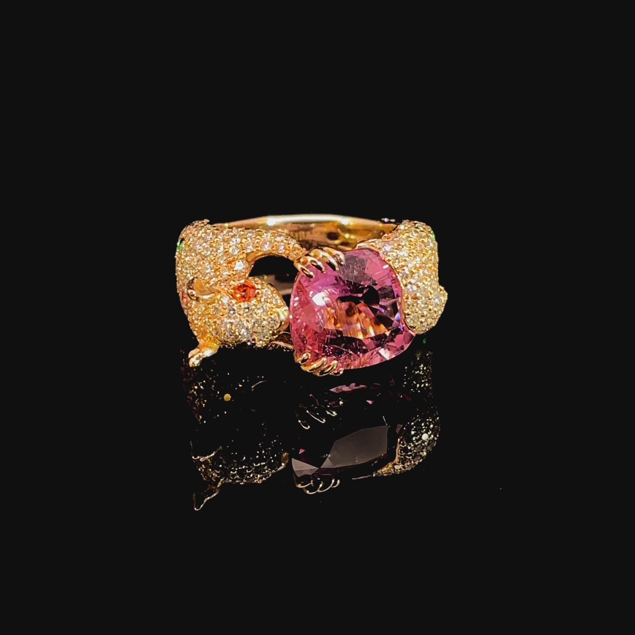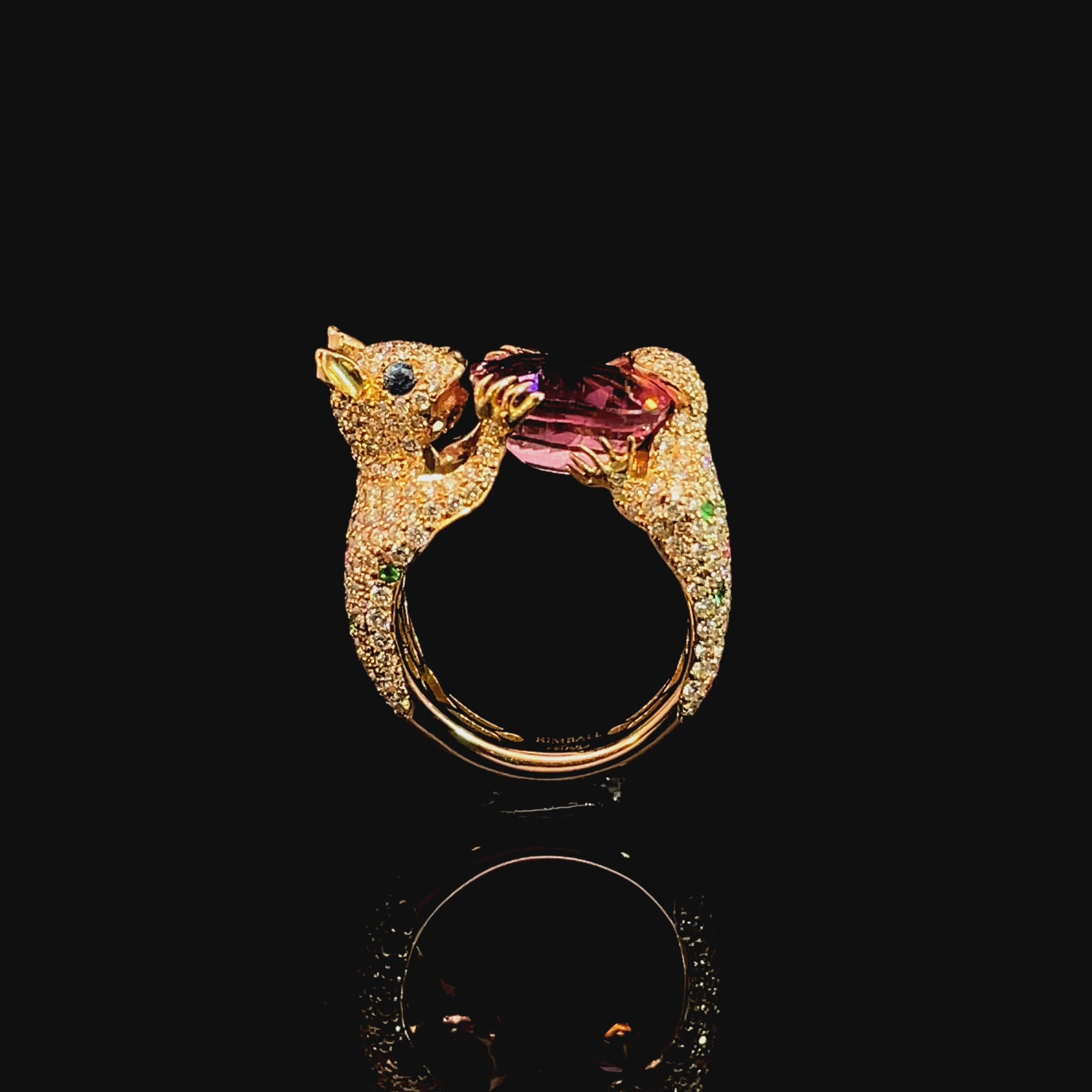 Squirrel in diamond version. with Bubblegum pink tourmaline extra large oval. Natural brilliants pavé in EFG VS+, top cut. Some emeralds for contrast. Most exclusive and cutest of tree dwellers! Pink gold 18kt.