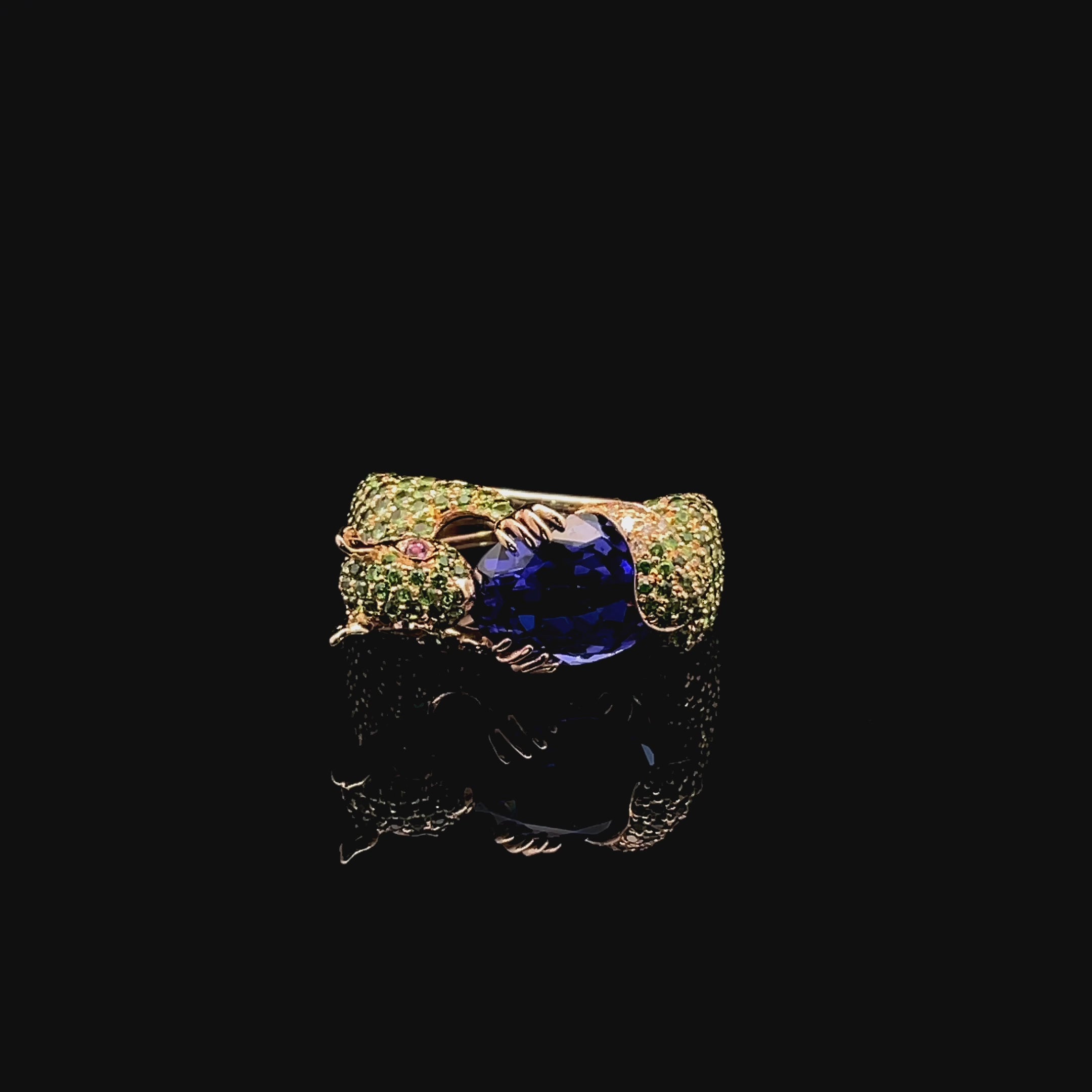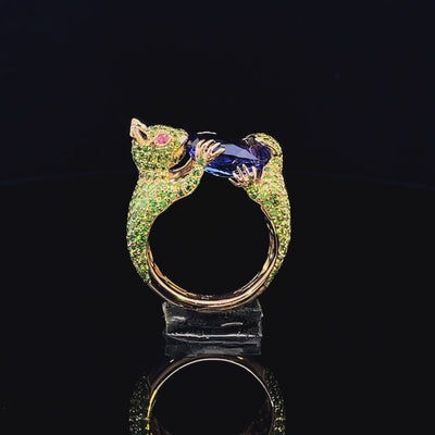 Natural Tanzanite oval of over 5 carats, AAA colour grade. Tsavorite pavé for ultimate contrast. Squirrel shaped ring in pink gold 18kt. Unique design. Extraordinary hip work of art!