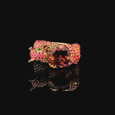 Hue on hue for high artistic Kimball vibe. 'A' grade natural red ruby pavé. Large dark pink tourmaline oval. Pink gold 18kt.