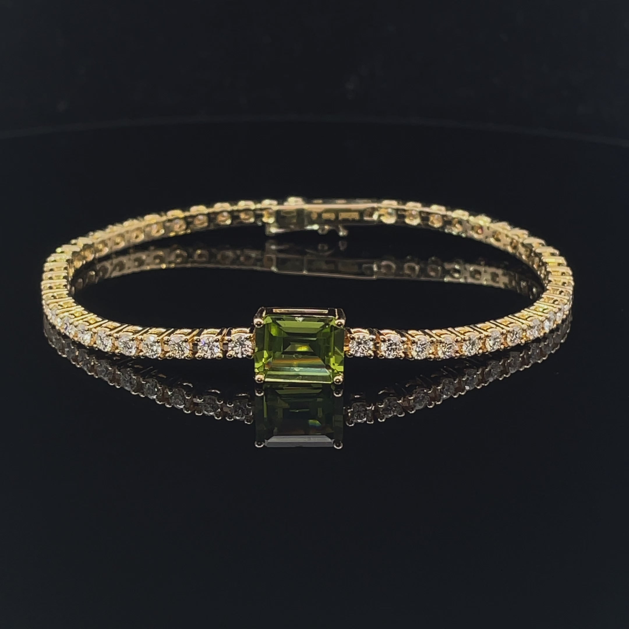 Large 'A' grade peridot emerald cut. Natural white diamonds in FG VS, top cut, with an average of 0.045 cts pp. Houseblend signature duo. Yellow golden tennisbracelet 18kt.