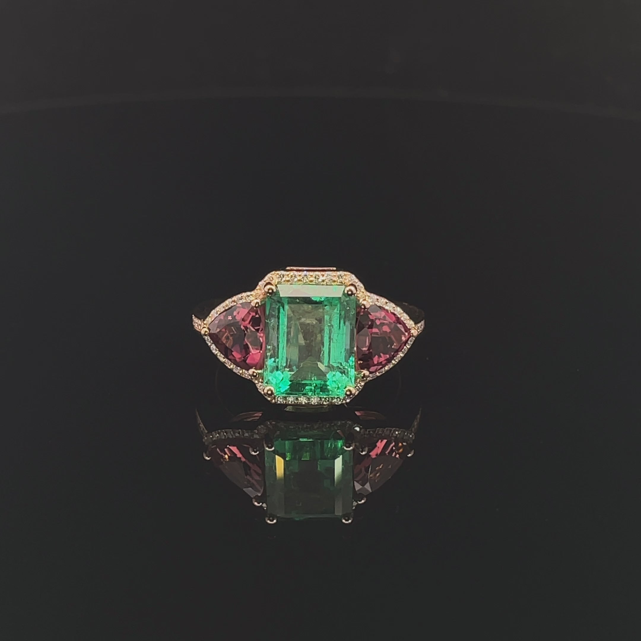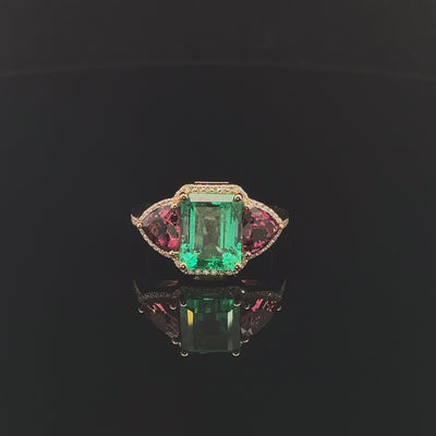 Natural Colombian Emerald. Blueish green 'A' colour grade, 'Si 3' purity or better, emerald cut. 3 carats++, AGLT certificate. Minor clarity enhancements. Couple of intense pink tourmaline trilliants. Diamond finish FG VS. Pink gold 18kt. Price on request based on availble middle stones. Investment piece.
