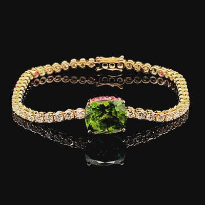 Oversize 'AA' grade peridot cushion in Kimball Case with tsavorite and fuchsia sapphire setting. White natural diamonds in FG VS, top cut, with an average of 0.09 cts pp. Yellow golden tennisbracelet 18kt. Extraordinarily unusual in size.