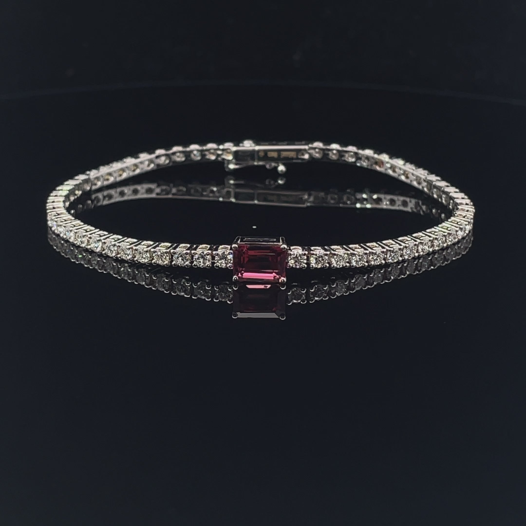 Pink tourmaline emerald cut. White natural diamond brilliants in top cut, D-G vs of 0.03 cts average pp. Signature duo emerald/fushsia sapphire. White gold tennisbracelet 18kt.
