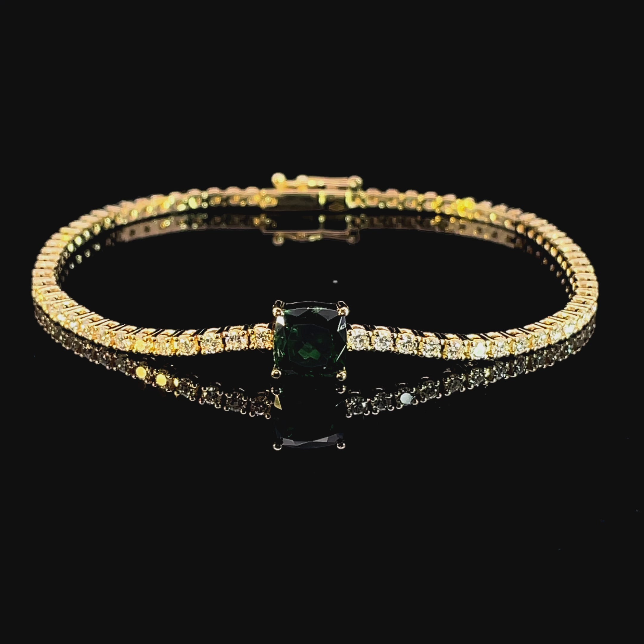 Deep pine green Tsavorite square cushion. Diamond brilliants of natural origine in finest make, EFG SI1 with an average of 4 points per piece (2.15 mm). Brand signature. Yellow golden tennis bangle, an eternal classic with a modern twist.