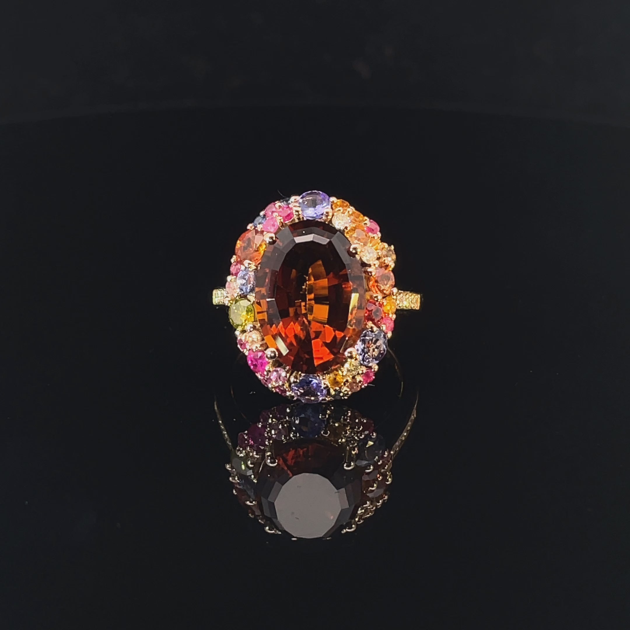 Dark copper Palmeira with Tanzanite and natural corrumdum bouquet. Natural diamonds present. 18 kt yellow gold.