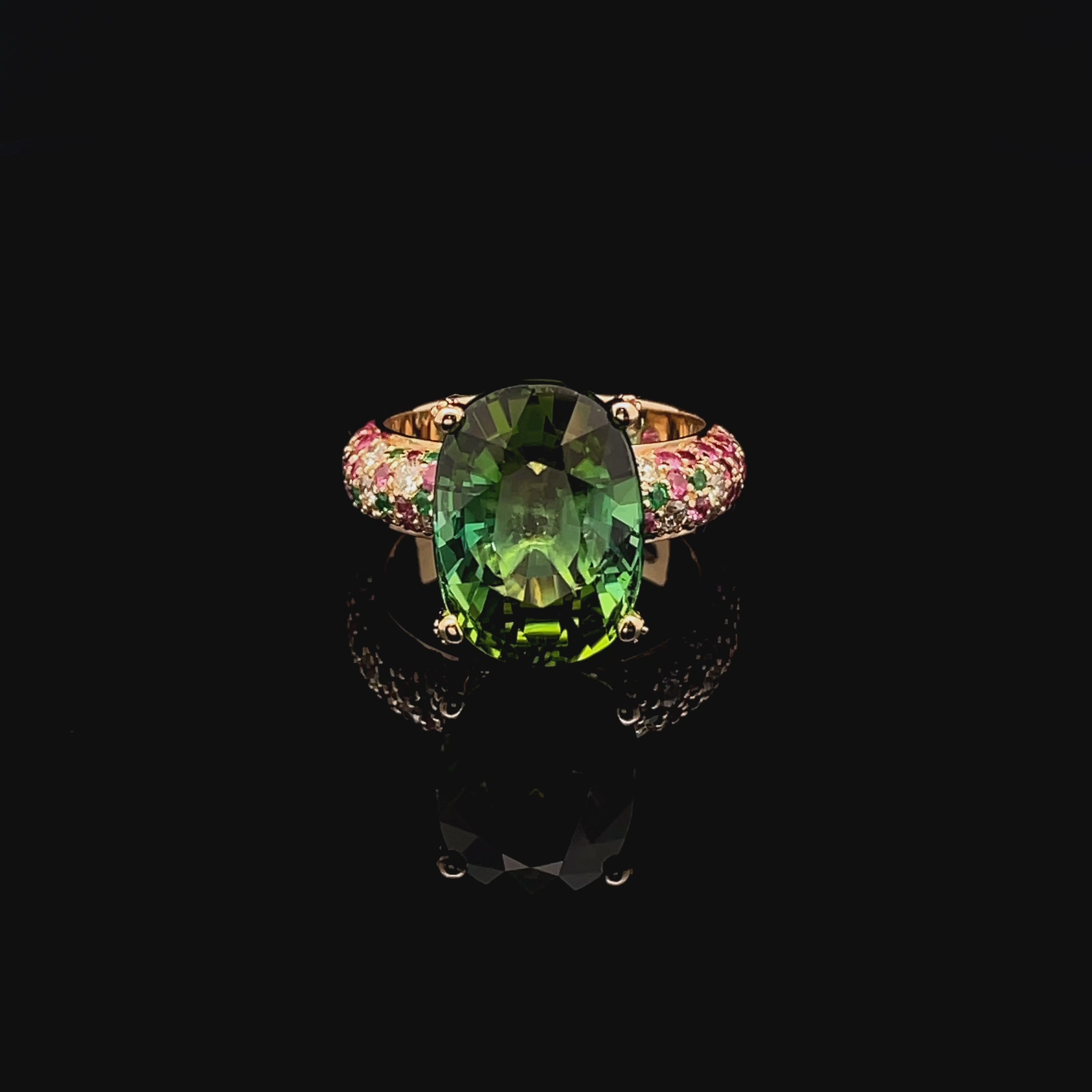 Over eleven carats 'AA' grade green tourmaline oval of rare minerality here. White diamonds, pink sapphires, rubies and tsavorite in shank for hypnotizing dots aspect. Pink gold 18kt. Mail us for more specific pricing. Many possibilities on level of centre stones and budgets.