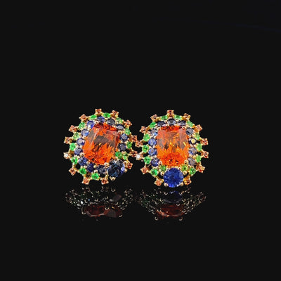 Best quality Mandarin garnets on the market. Rich contrast with Colombian emeralds and natural orange sapphires. Kimball twist lies in the asymmetrical placement of cornflower blue sapphires. Made to order per pair according to available centre stones. Prices may vary. Pink or yellow gold 18kt.