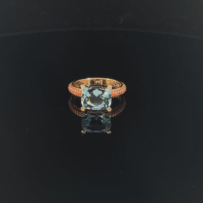 Large cushion shape 'A grade' aquamarine in triple 1.1 mm row orange sapphire ring, blue corrundum and white diamond finish. Pink or yellow gold 18kt.