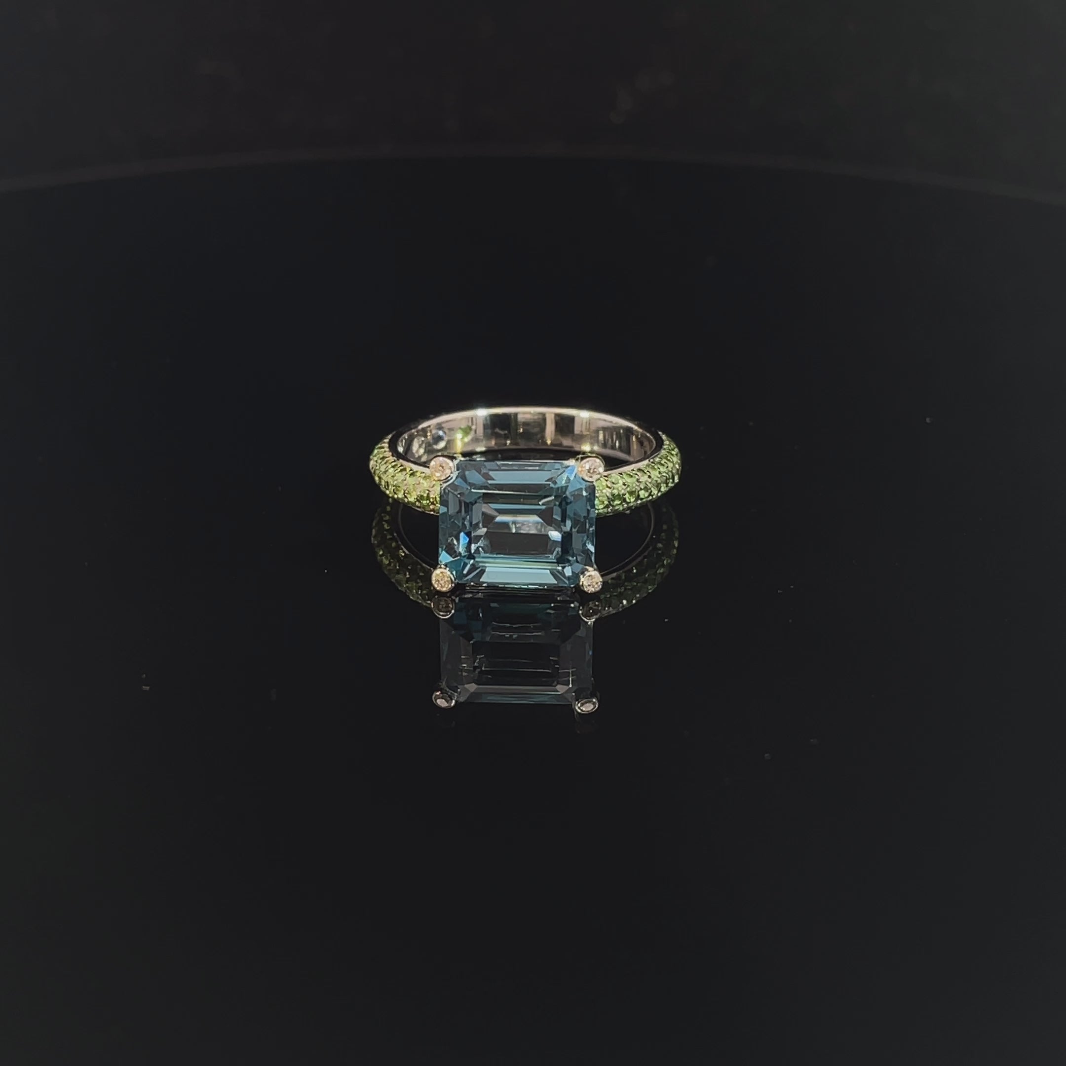 London blue topaz emerald cut in 3 row tsavorite ring, 1.1 mm. Diamond finish. White gold 18kt. Punchy contrast as base for futher stacking.