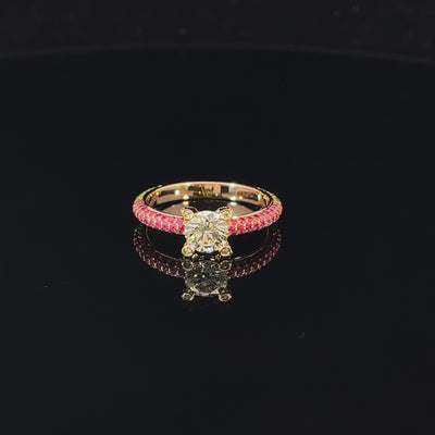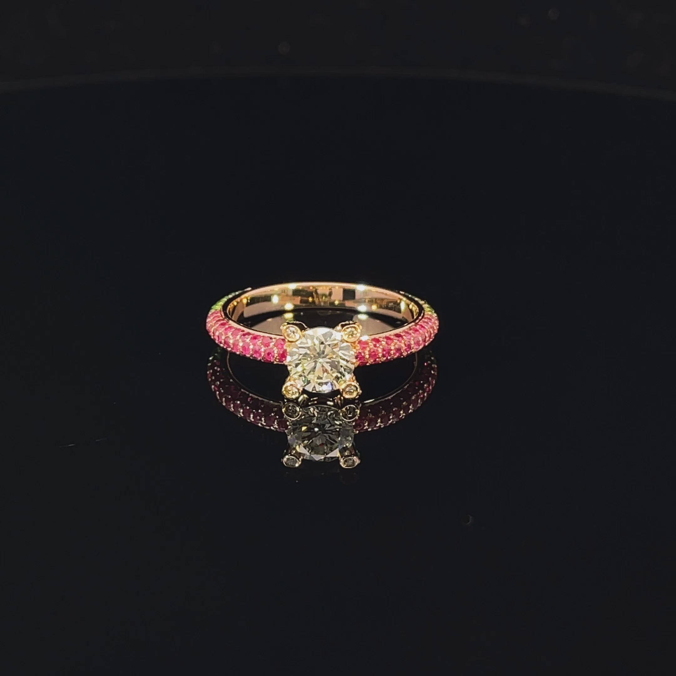 Natural round diamond 0.60 cts I VS1vg ex ex HRD in this specific jewel. Triple ruby and tsavorite finish. Pink gold 18 kt. Ranging from 0.30-0.90 cts, all colours from IF to Si1 upon request. Finest cut only, ethical sourcing. HRD/GIA. Contact us for stocklist according to your budget and occasion.
