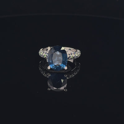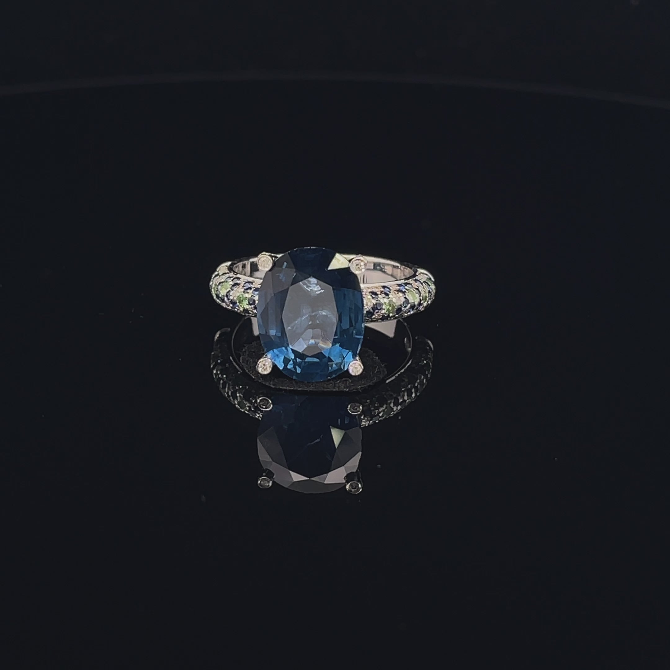 Natural deep blue sapphire, AGLT certificate. 5.01 carats oval shape. Sapphire, diamonds and tsavorite arrangements. White gold 18 kt.