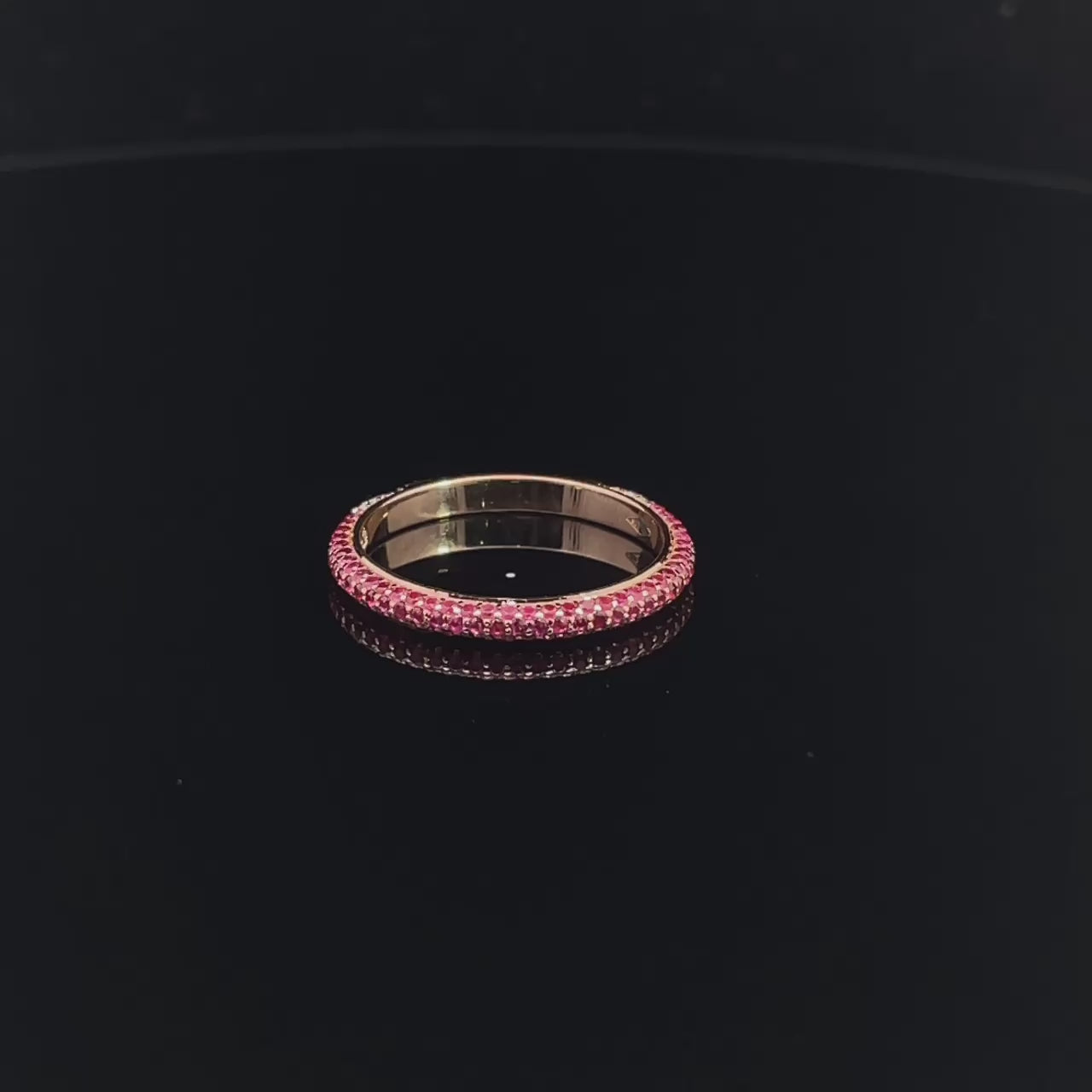 Natural red or purpelish rubies, white diamonds, 1.1 mm. 3 row housestyle setting. Pink gold 18kt. Essential stacking band to upgrade your current jewerly box.
