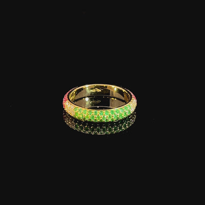 Natural emeralds, diamonds FG VS and rubies, 1.3 mm. 3 row housestyle setting. Yellow gold 18kt.