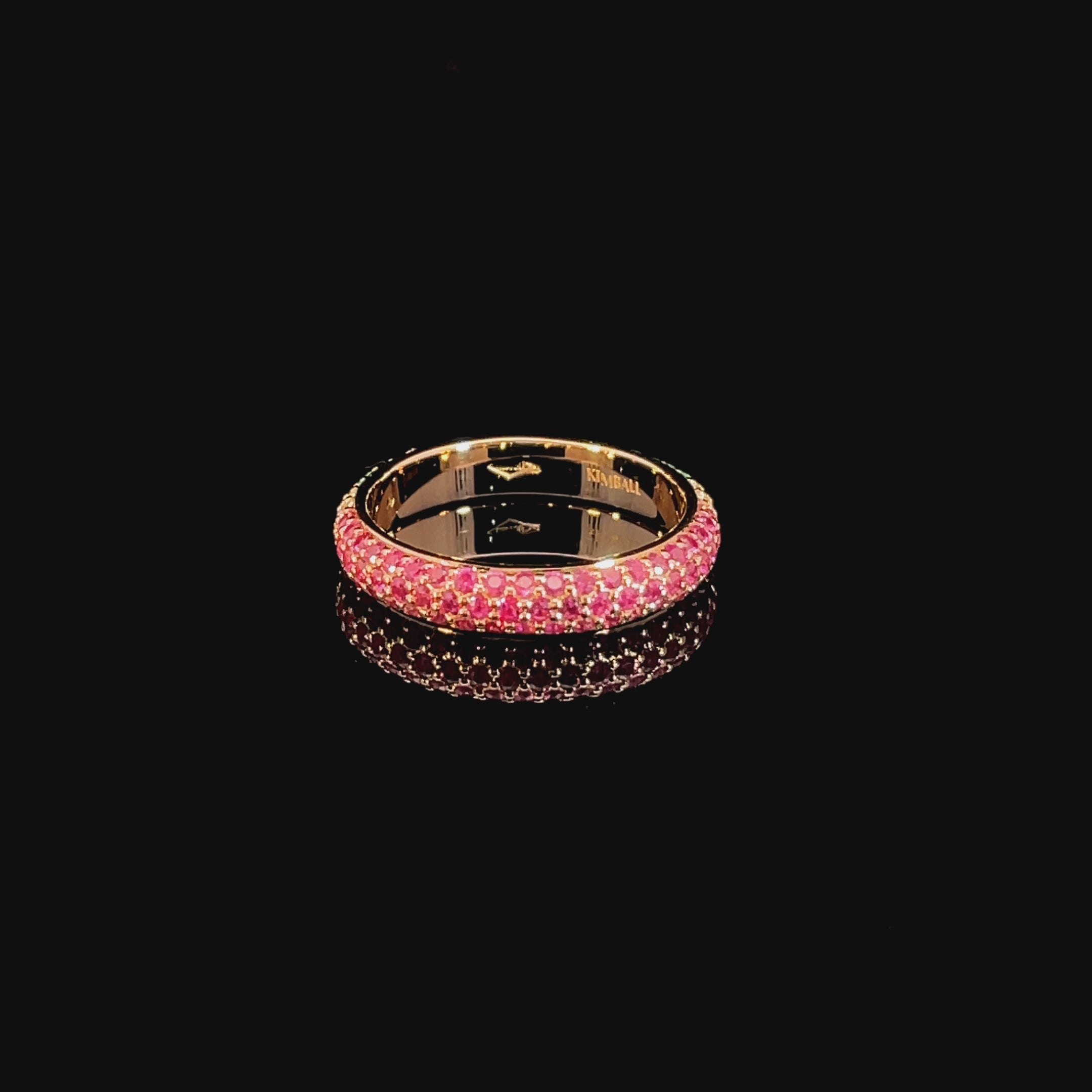 Natural rubies, white diamonds and Colombian emeralds, 1.3 mm. 3 row housestyle setting. Pink gold 18kt.